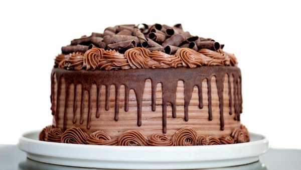 Pastel relleno de crema o chocolate y cubierto de chocalte funfido y en trozos decorado con crema y chocolate